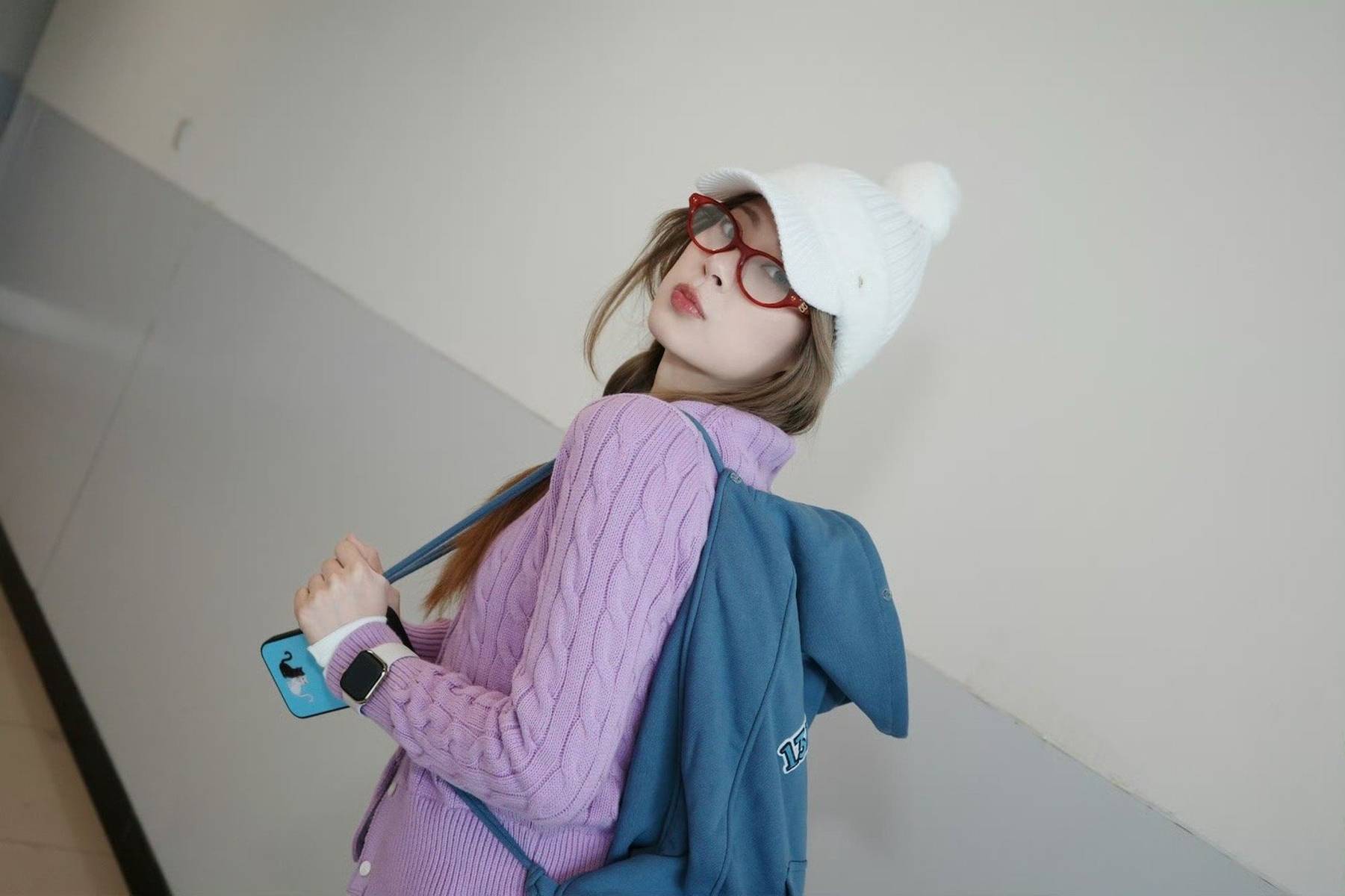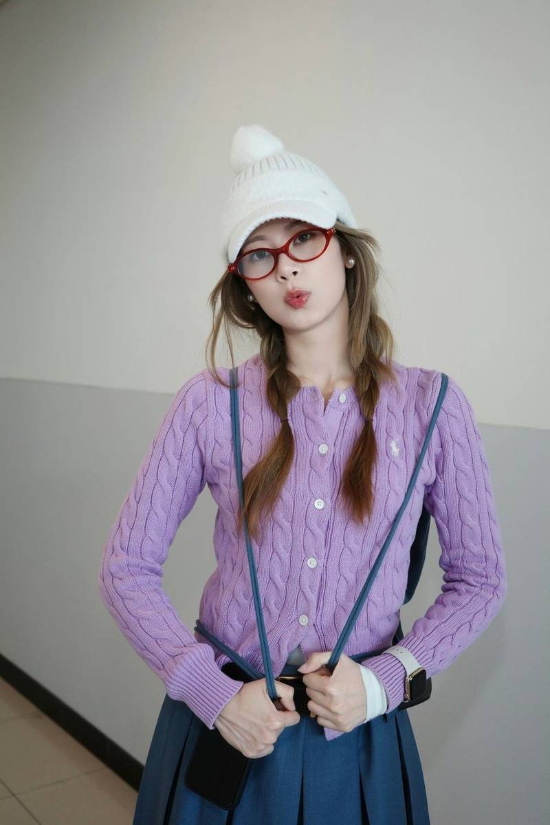 少女感的塑造往往藏在细节之中,赵昭仪的这组造型在细节处理上堪称满分。白色棒球帽没有刻意戴得规整,而是微微倾斜,帽檐遮住部分额头,既营造了随性的氛围,又让面部轮廓显得更加精致;紫色针织衫的袖口随意挽起,露出纤细的手腕,增添了几分慵懒的气质;藏青色百褶裙的高腰设计不仅优化了身形比例,更让她在行走时身姿挺拔,透着少女的朝气。这些看似不经意的细节,共同构建了立体饱满的少女形象,让整体造型更具感染力。