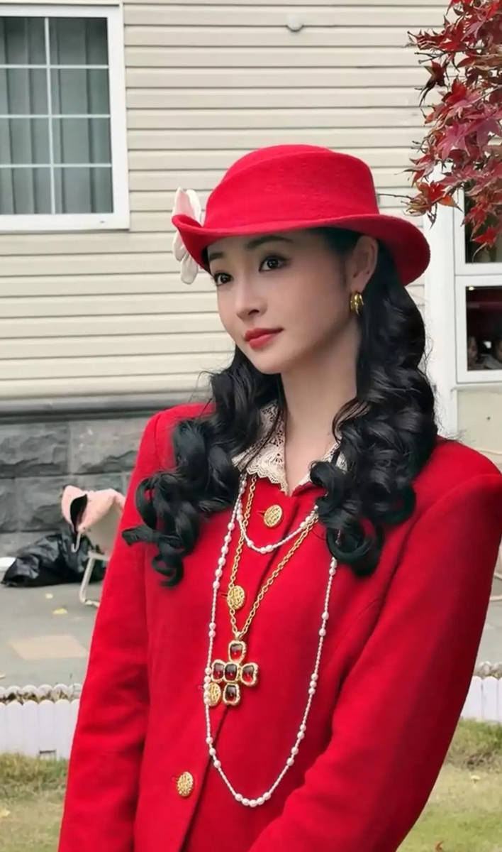 民国美学的核心在于“中西合璧”,而周洁琼的造型恰好完美诠释了这一点。红色是最具代表性的中式色彩,象征着吉祥与活力,而西装套裙则是西方服饰的经典款式,代表着现代与独立。这种组合在民国时期本就是新女性的标志性装扮,周洁琼将这种经典元素重新演绎,去掉了年代感的陈旧,保留了核心的优雅与独立。她的卷发造型也并非完全复刻民国样式,而是融入了现代的蓬松感与层次感,让发型既复古又时尚,更符合当代人的审美需求。