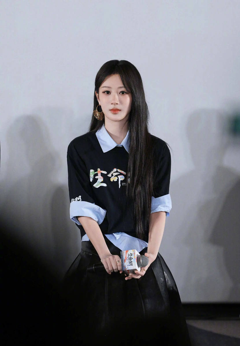 而活动现场的造型,则是她从角色中抽离后的温柔回归。柔顺的黑长直是她特意养回的发型,发尾带着自然弧度,与剧中被风沙吹乱、干枯毛躁的短发形成鲜明对比;精致的妆容掩盖了高原日晒的痕迹,却藏不住眼底因角色沉淀的坚毅。活动中她全程笑容温和,主动与现场媒体、粉丝挥手致意,签名时耐心倾听粉丝诉求,亲和力拉满。当她笑着谈起拍摄经历,说自己“跑完戏倒在地上感觉呼吸不了”时,眉眼间既有白菊的倔强,又有杨紫的柔软,这种角色与自我的深度融合,让造型更具故事感与感染力。