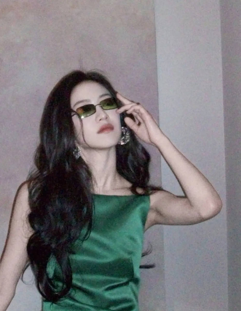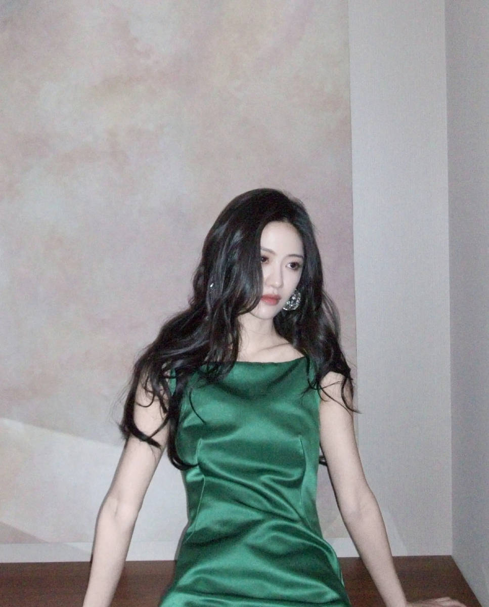 造型细节的把控,更凸显了她对风格转型的精准认知。不同于甜妹风常用的浅色系、蓬蓬裙,墨绿缎面裙自带沉静高级的属性,缎面材质的光泽感与胶片的颗粒感碰撞,弱化了少女的娇憨,强化了冷艳的气质;大波浪卷发取代了灵动的高马尾,蓬松的发丝与慵懒的弧度,为整体造型增添了复古摩登感,让她的五官优势更加突出——优越的肩颈线在发丝的映衬下愈发清晰,冷白肌肤与墨绿色形成强烈视觉冲击,眉眼间的疏离感被放大,辨识度瞬间提升。