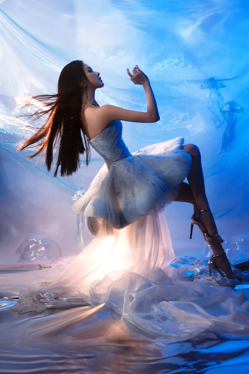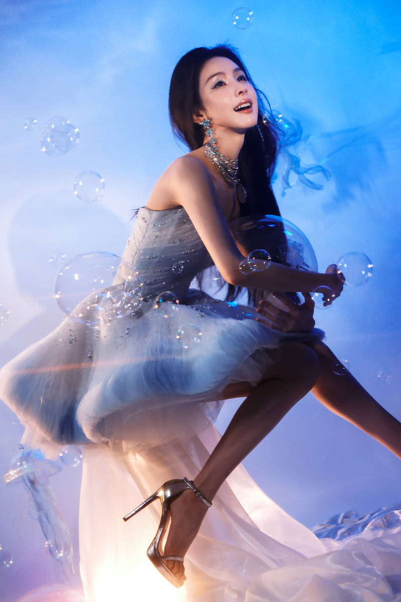 这组蓝色闪钻写真,正是她风格蜕变的集大成之作,既保留了自身的清冷底色,又注入了浪漫灵动的元素,形成独树一帜的“清冷浪漫风”。不同于其他女星演绎海洋主题时的甜腻或艳丽,陈都灵的表达更显克制与高级。她没有刻意模仿公主的娇俏姿态,而是以沉静的眼神、松弛的姿态,将海洋的辽阔与神秘藏于气质之中。闪钻纱裙的华丽与她自身的清冷气质形成巧妙平衡,星星耳坠的点缀增添了灵动气息,温柔的笑容则弱化了闪钻的冷感,让整体造型既有视觉冲击力,又耐人寻味。这种风格的形成,源于她对自身气质的精准把控——她深知自己的优势在于面部骨骼的精致与眼神的故事感,因此在造型中不追求元素的堆砌,而是以服装为载体,放大自身的气质亮点。