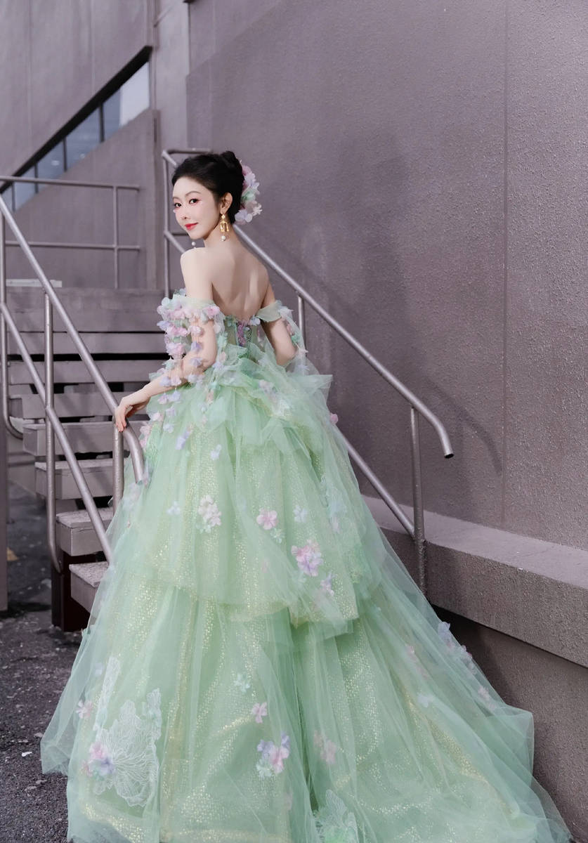 礼服与发型的风格碰撞,是这组造型的核心亮点。绿色抹胸纱裙自带优雅精致的属性,抹胸设计凸显肩颈线条,纱质裙摆营造仙气氛围,本是偏向正式场合的造型,却在猫耳朵发型的加持下,多了几分少女的俏皮灵动。这种风格碰撞并非生硬叠加,而是精准把握了比例与尺度——礼服的优雅基调奠定了造型的高级感,避免了猫耳朵发型可能带来的幼稚感;猫耳朵的俏皮元素则中和了礼服的正式感,让整体造型更具亲和力。宣璐的五官自带温柔底色,眉眼弯弯时满是治愈感,搭配猫耳朵发型后,更添几分灵动娇俏,与绿色纱裙的仙气完美适配,让甜酷碰撞的造型更具说服力。