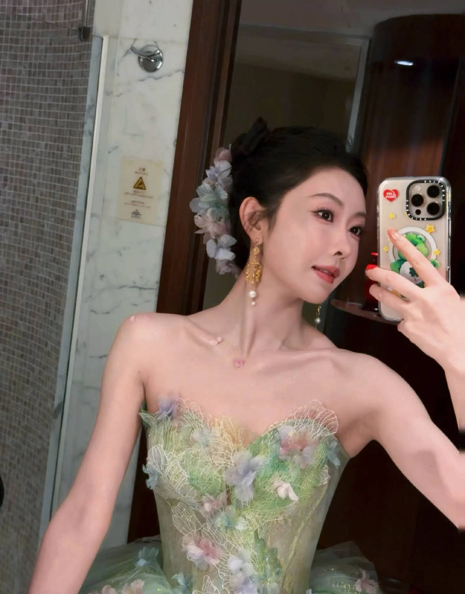 宣璐的时尚可塑性,在这组绿裙美图中展现得淋漓尽致。绿色抹胸纱裙的优雅、猫耳朵发型的可爱、对镜自拍的灵动,三种元素相互碰撞融合,打破了单一风格的局限,打造出甜而不腻、雅而不闷的精灵感造型。从《陈情令》中温柔温婉的师姐江厌离,到职场造型里干练利落的轻熟女,宣璐始终在不同风格中切换自如,而这组造型则为她解锁了新的时尚赛道——将优雅礼服与俏皮元素结合,构建出独属于她的精灵感穿搭范式,既贴合自身气质,又跳出了传统礼服造型的刻板框架,展现出多元的时尚魅力。