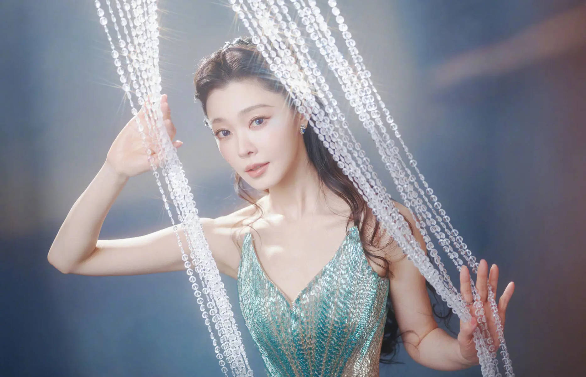 V领礼服裙作为造型的核心单品,其风格定位直接决定了妆容的走向。这款礼服裙自带华丽梦幻的属性,V领设计优雅大气,裙摆的光泽感与灵动性指向了浪漫的人鱼主题,因此妆容必须摒弃厚重与艳丽,以清透、灵动为主,才能避免造型的杂乱感。宋轶的新妆容恰好遵循了这一逻辑,清透的底妆弱化了妆感,让皮肤呈现出自然通透的状态,与礼服的光泽感形成呼应,而非相互抢夺焦点。眼妆的珠光元素与礼服的细碎光泽相呼应,唇妆的浅色系则平衡了礼服的华丽感,让整体造型主次分明,高级感拉满。