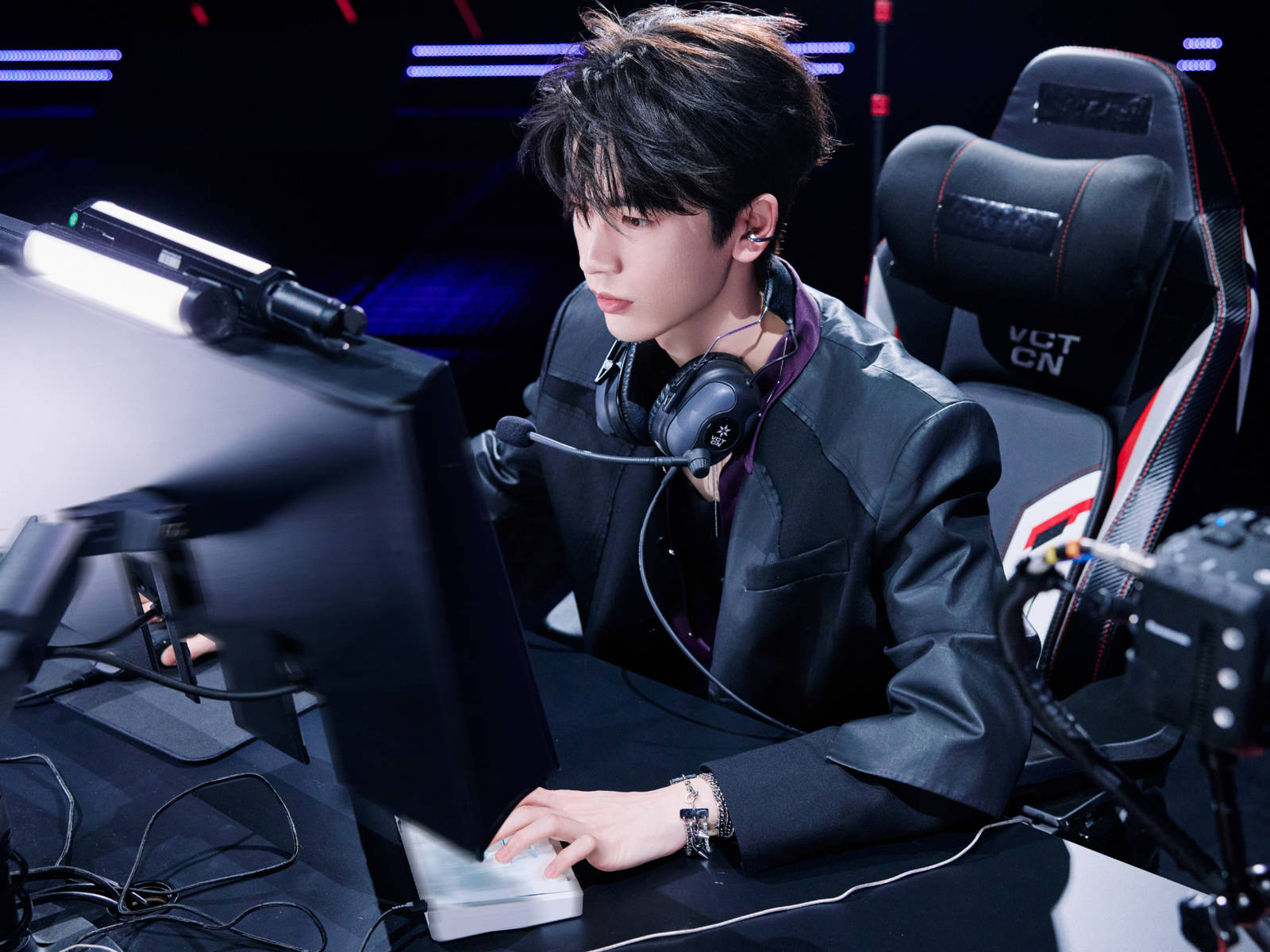 这组帅照的核心亮点,无疑是张凌赫贴合电竞主题的酷飒穿搭,每一处细节都暗藏巧思,精准拿捏电竞男神的核心调性。他身着一件黑色利落皮衣,版型简约大气却极具设计感,利落的剪裁完美凸显出他190cm的挺拔身形与优越肩颈线,宽肩窄腰的比例被展现得淋漓尽致,自带强大的气场buff。皮衣面料质感细腻,哑光光泽自带冷冽滤镜,没有多余的装饰堆砌,仅靠简约的线条与利落的版型,便将电竞男神的酷飒与凌厉展现得淋漓尽致,同时又暗藏几分贵气,完美平衡了街头潮流与精致质感。