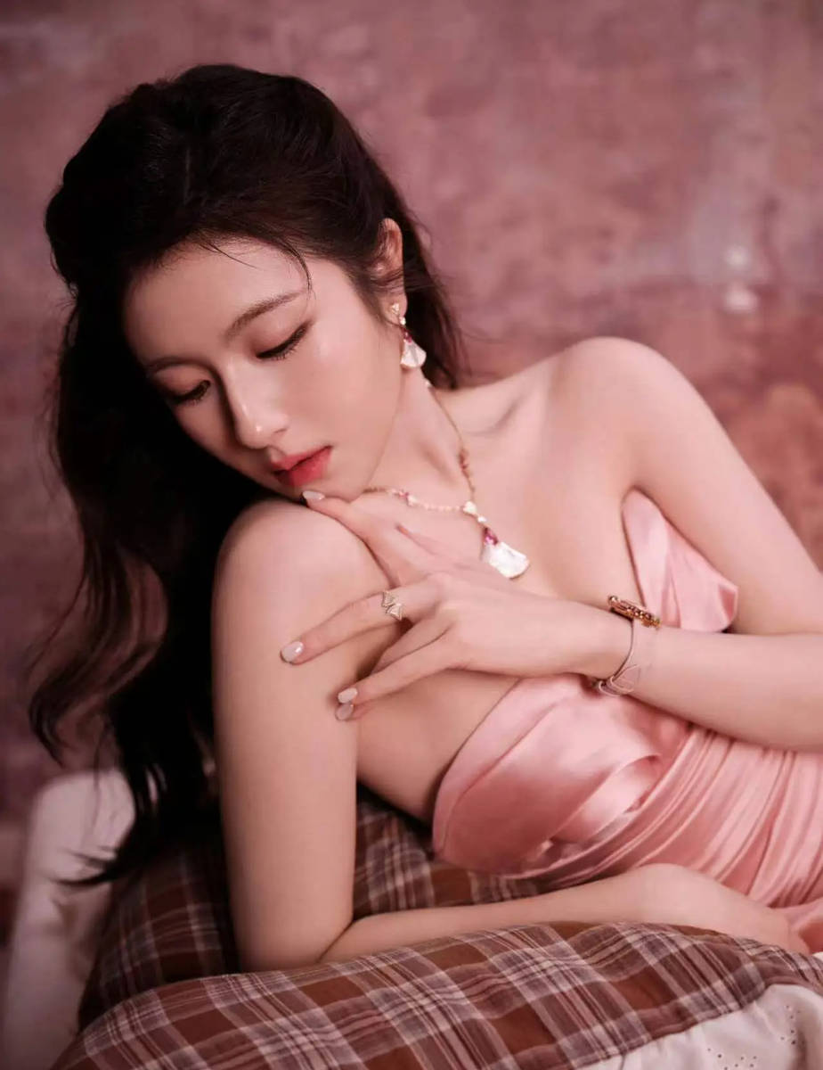 粉缎抹胸裙的选择,是整个造型的核心,也是仙气与童趣融合的关键。首先,色系的选择暗藏巧思,粉色作为自带清甜属性的色系,是童趣风的经典选择,淡淡的粉调温柔又显白,没有亮粉色的刺眼,也没有浅粉色的寡淡,恰到好处地凸显了李兰迪的少女感,自带童趣氛围;而丝缎面料的运用,则为造型增添了仙气与高级感,丝缎的光泽感柔和细腻,打破了粉色的幼稚感,让童趣造型多了几分仙气,二者完美融合,既清甜又高级。