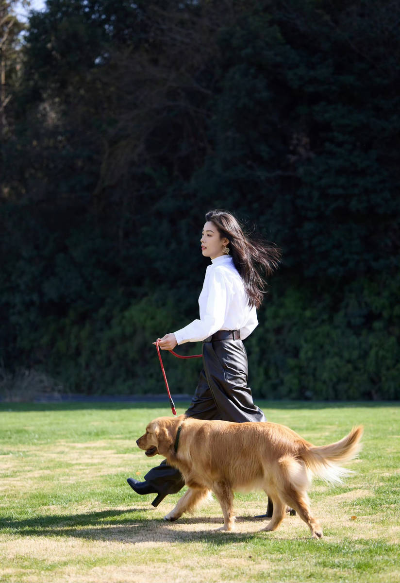 除了穿搭的亮眼表现,陈丽君的姿态与神情,更是这组写真的灵魂所在。她全程没有刻意摆拍,每一个动作都自然流畅,尽显随性自在的状态。在草坪上,她时而牵着金毛犬漫步,身姿舒展、步伐轻盈,神情放松,嘴角带着淡淡的笑意,仿佛在享受这片刻的宁静与美好;时而停下脚步,与金毛犬玩耍互动,低头抚摸爱犬的脑袋,眼神里满是宠溺,笑容灿烂而真诚,瞬间融化人心;时而侧身站立,望向远方,身姿挺拔,眼神清澈而坚定,既有飒爽的气场,又有温柔的韵味,每一个姿态都极具记忆点。