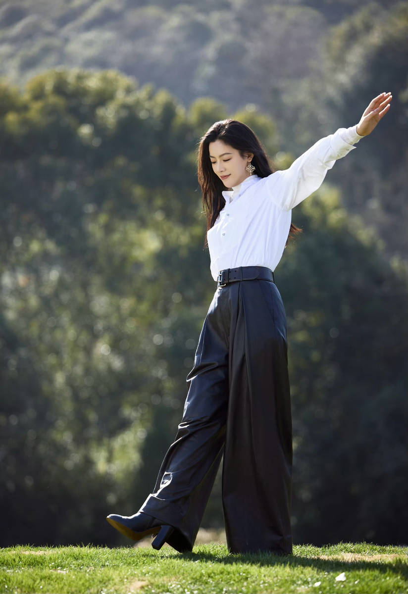 穿搭上,陈丽君选用白衬衫与黑皮裤的经典搭配,看似简约,却在细节处彰显时尚巧思,将飒爽与温柔完美平衡。白衬衫选用宽松适度的版型,既不会显得臃肿拖沓,又能修饰身形,展现出松弛自在的状态,领口随意解开,袖口自然挽起,每一个细节都透着随性与慵懒,没有刻意的精致,却更显真实动人。白衬衫的干净清爽,与陈丽君身上的通透气质完美契合,让她看起来更具温柔感,而搭配的黑皮裤,则为整体造型注入了酷飒气场,修身的版型完美勾勒出她纤细笔直的双腿,皮质面料的光泽感提升了整体造型的高级感,与白衬衫的温柔形成鲜明对比,一柔一刚间,尽显陈丽君的多元魅力。