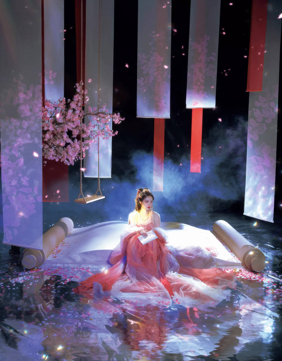王楚然本身就自带古典美人的气质,眉眼精致、轮廓柔和,自带一种温婉妩媚的气场,而这款桃花精造型,恰好将这种气质放大,让她看起来宛若真正的桃花精,从神话传说中走出,甜而不腻、媚而不俗。她的眼神里既有少女的灵动与纯真,又有女子的妩媚与风情,举手投足间,既有桃花的娇俏,又有古典美人的温婉,将“桃花精”的角色演绎得入木三分。