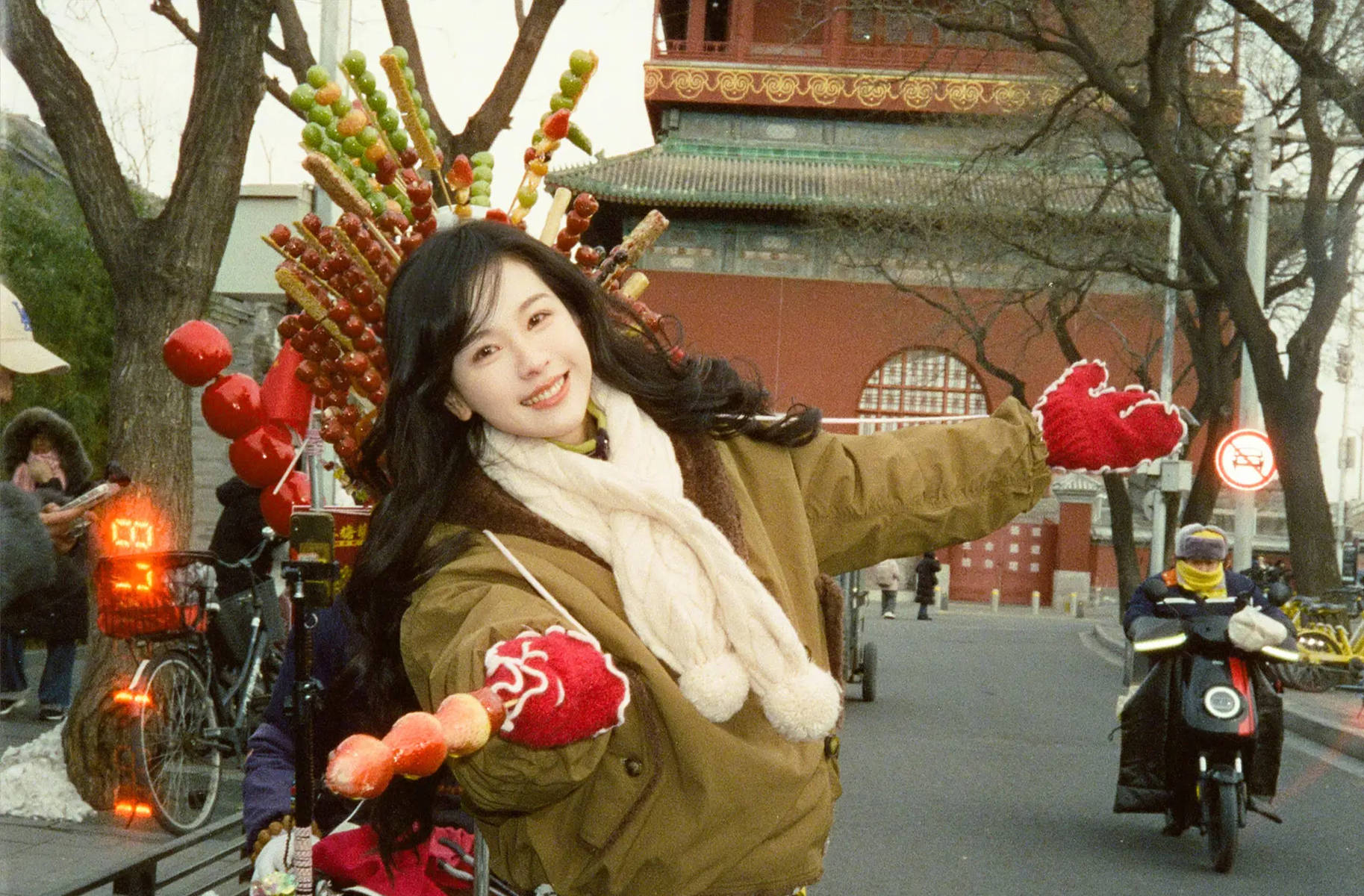 这组随拍的最大亮点,便是陈都灵的气质反差,而糖葫芦与鼓楼的搭配,恰好放大了这种反差之美。以往的陈都灵,无论是穿搭还是神情,都透着一股清冷文艺的气质,眉眼间带着淡淡的疏离感,让人不敢轻易靠近;而此次的随拍中,她手持糖葫芦,甜笑嫣然,眉眼弯弯,眼底藏着细碎的笑意,娇憨灵动的模样,瞬间褪去了清冷感,多了几分邻家女孩的亲切与可爱。红彤彤的糖葫芦,自带清甜的烟火气,与她以往清冷的气质形成鲜明对比,却又和谐共生,让她的气质更具张力。