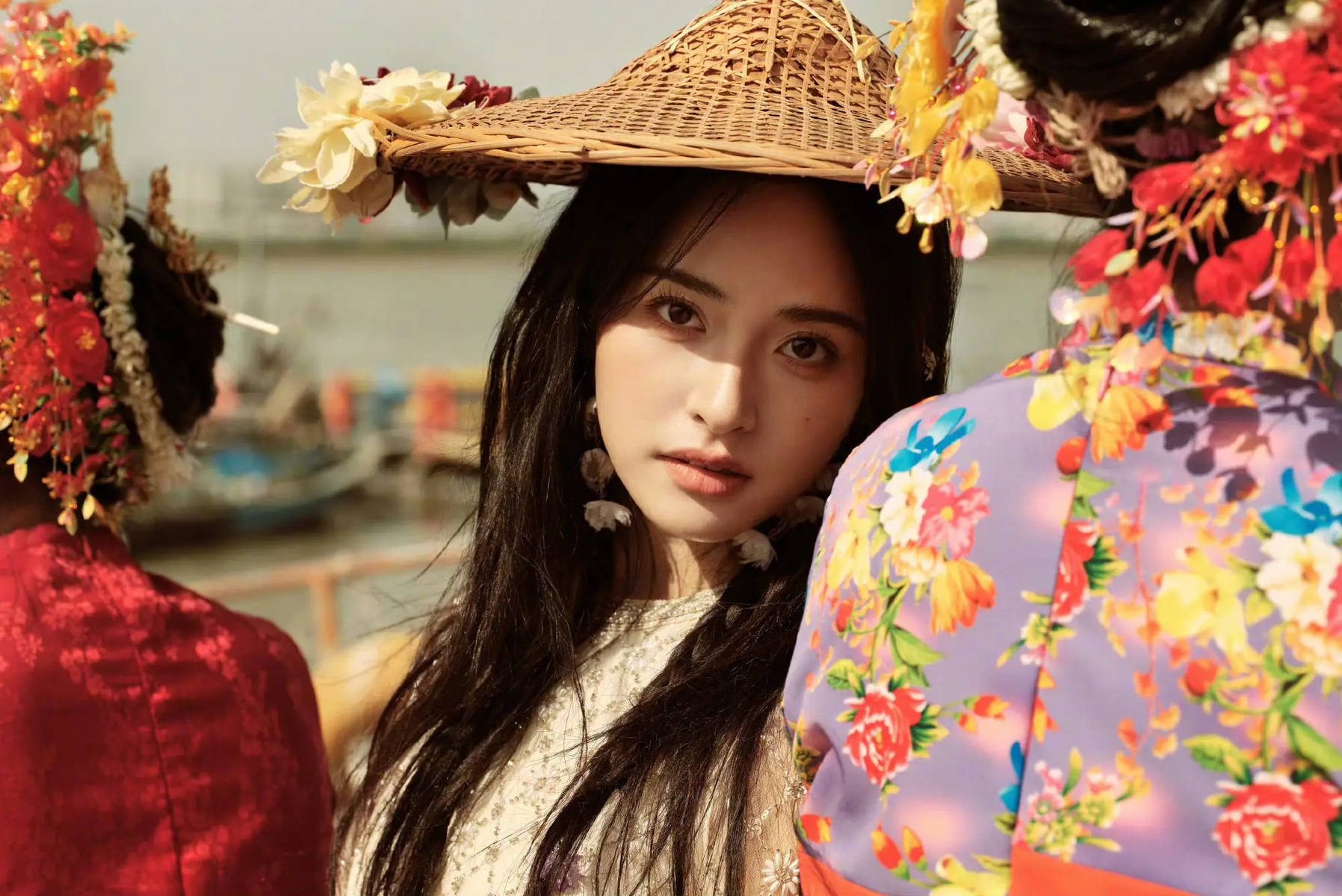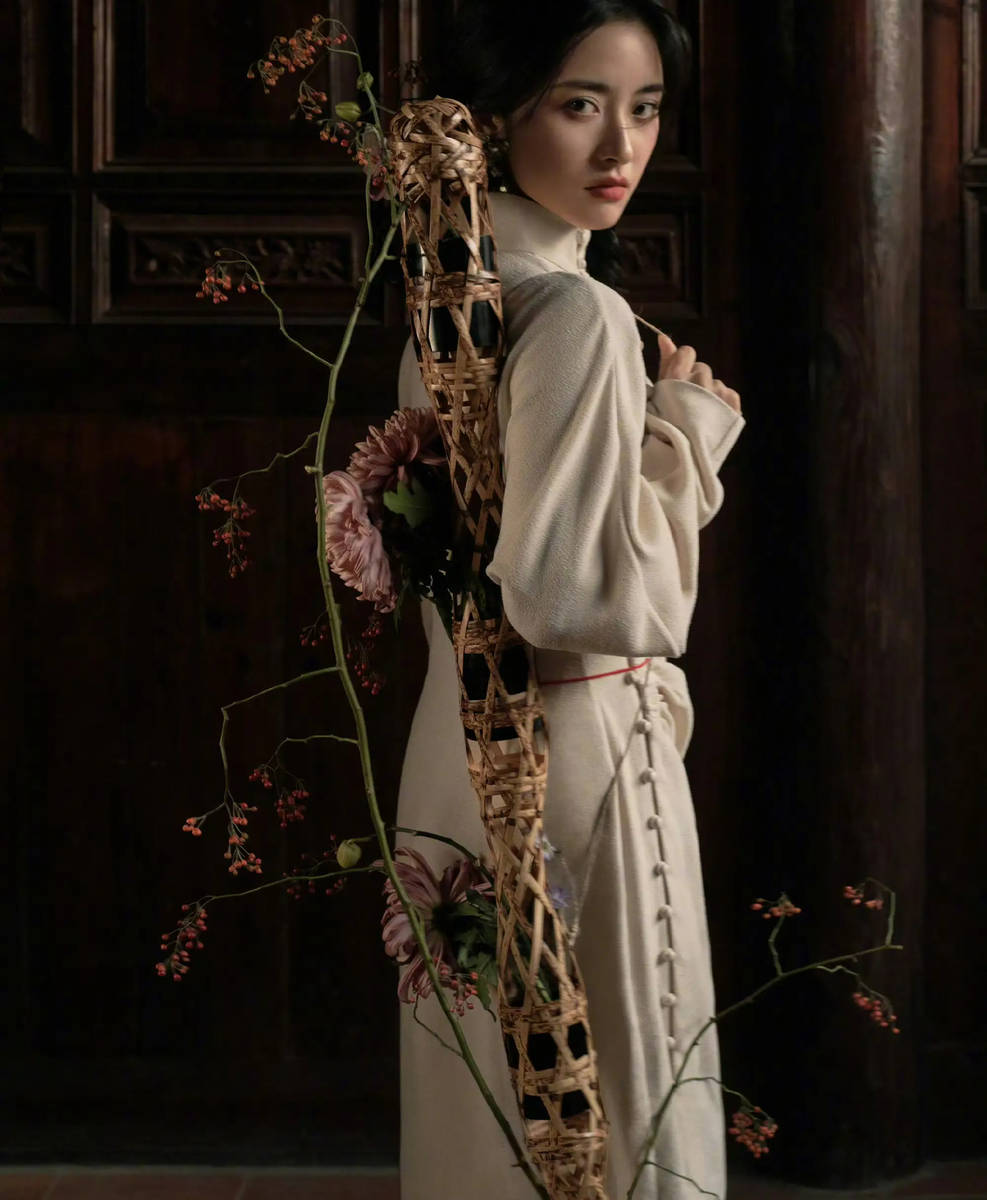 沈月的造型设计,每一处细节都暗藏巧思,将民俗元素的韵味展现得淋漓尽致。头戴的簪花斗笠,是民俗文化的经典载体,原木色的斗笠简约质朴,没有多余的装饰,却自带古朴雅致的气质;斗笠上点缀的簪花,选用淡雅的浅色系花朵,花瓣娇嫩,色泽清新,既增添了造型的灵动性,又中和了斗笠的厚重感,让整体造型更显轻盈。身后的竹编花架,手工编织的纹理细腻而有质感,透着自然的烟火气,与簪花斗笠相互呼应,让民俗氛围更加浓厚。